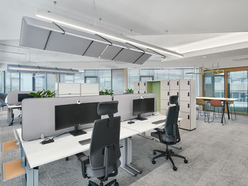 Auch gestalterisch setzt das Projekt Maßstäbe. Die überwiegend eingesetzten Produkte von Steelcase überzeugen durch Ergonomie, Flexibilität und eine harmonische Farb- und Formensprache. Ergänzend sorgen gezielt eingesetzte Akustikelemente von CAIMI - SNOWSOUND OFFICIAL in Decken und Möblierung für eine angenehme Raumakustik, selbst in hoch frequentierten Bereichen.