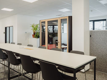 Die Großraumbüros wurden mit modernen Arbeitsplätzen ausgestattet und um Telefonboxen ergänzt, die konzentriertes Arbeiten und ungestörte Gespräche ermöglichen. Ergänzend dazu entstanden mehrere kleine Besprechungsräume für zwei bis sechs Personen, die Raum für kurze Abstimmungen und private Gespräche bieten. Für größere Meetings steht ein Besprechungsraum mit einem Tisch für bis zu vierundzwanzig Personen zur Verfügung.